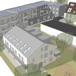 Geplant sind insgesamt 19 Wohnungen und fünf Gewerbeeinheiten, davon eine Arztpraxis, sowie eine Kindertagesstätte. In der Tiefgarage gibt es 28 Stellplätze und die Abstellflächen für Fahrräder.